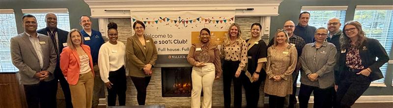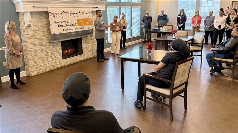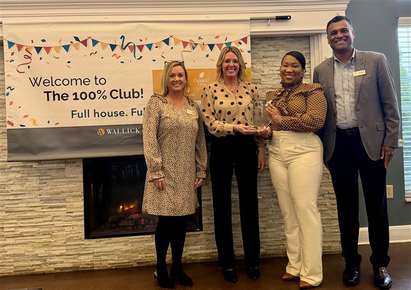 Last week, Wallick Senior Living SVP Abraham Mathew and VP Angela Arrowood, CEO Amy Albery, Executive Directors and other team members from across our communities visited the community to present Ashli with the 100% Club Award to honor this milestone.